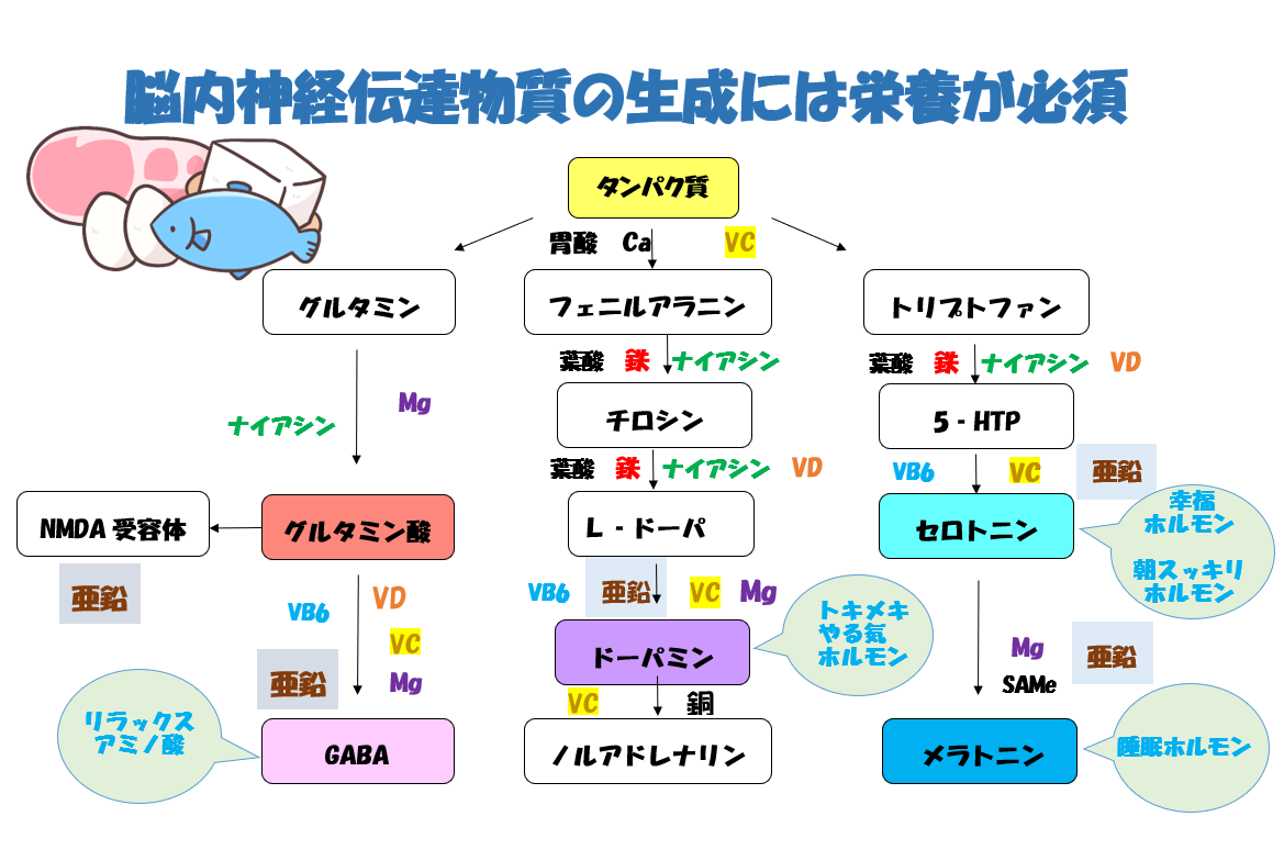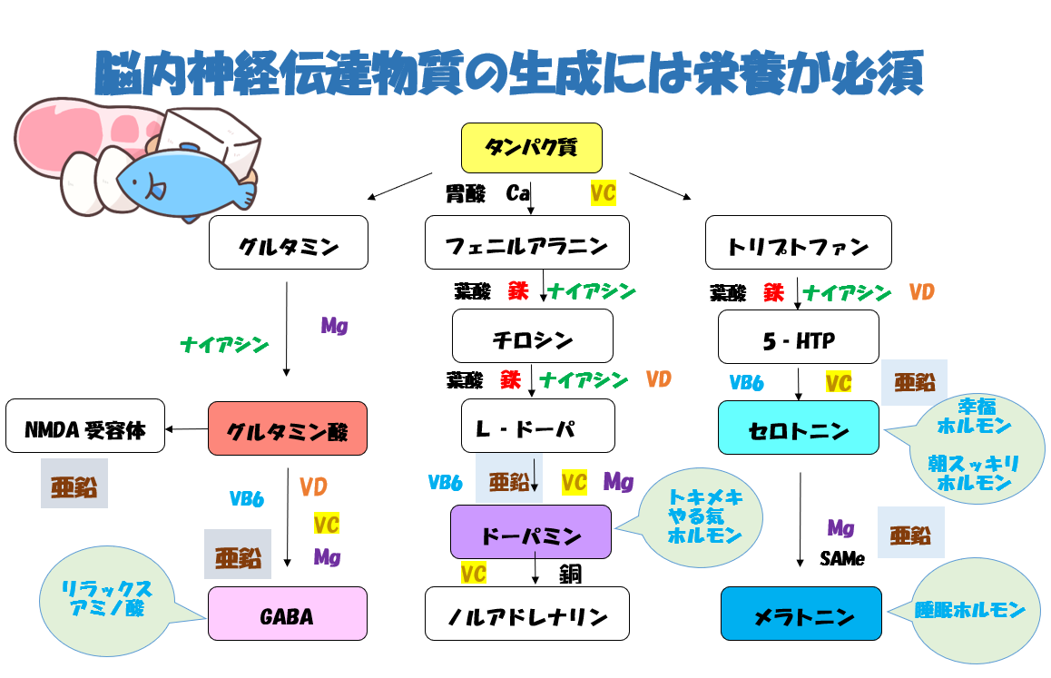 タンパク質をスタートとして、カルシウム、ビタミンC、葉酸、鉄、ナイアシン、ビタミンビー6、マグネシウム、ビタミンD、亜鉛等は脳内物質の生成に関わっています!